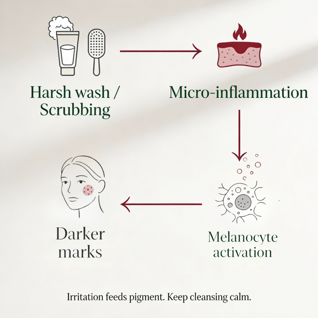 Over‑cleansing or using harsh, alkaline face washes increases inflammation and dryness, which in turn up‑regulate pigment pathways.